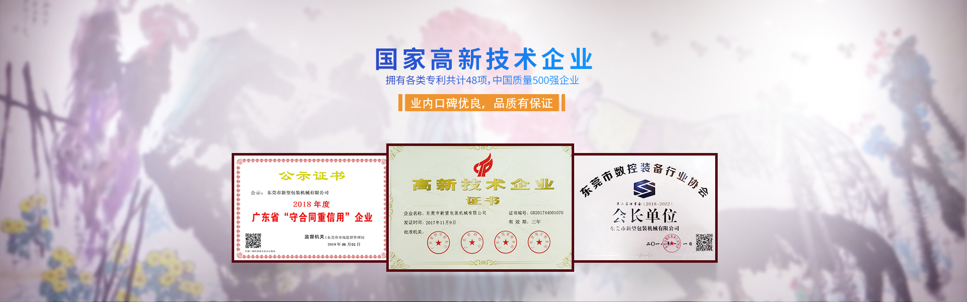 新望機械成立于1998年,位于東莞市東部工業(yè)園區(qū)的中心地帶——企石鎮(zhèn)東平村,交通方便、環(huán)境優(yōu)美舒適、視野開闊。公司注冊資本2000萬元,擁有辦公室、廠房等18,000多平方米。已通過ISO9001:2015國際質量管理體系認證,擁有國家各類專利共計58項。是東莞市企石鎮(zhèn)工商聯(lián)副會長單位、東莞市企石鎮(zhèn)文學藝術界聯(lián)合會副主席單位、東莞市環(huán)保包裝行業(yè)協(xié)會副會長單位、東莞市數控裝備行業(yè)協(xié)會第二屆會長單位、廣東省包裝技術協(xié)會常務理事單位、廣東省膠粘劑行業(yè)協(xié)會理事單位、廣東省著名商標企業(yè)、國家高新技術企業(yè)。